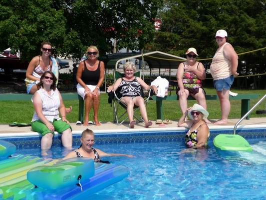 Ellen Carter (with legs in the pool), Kelly behind her (friend of