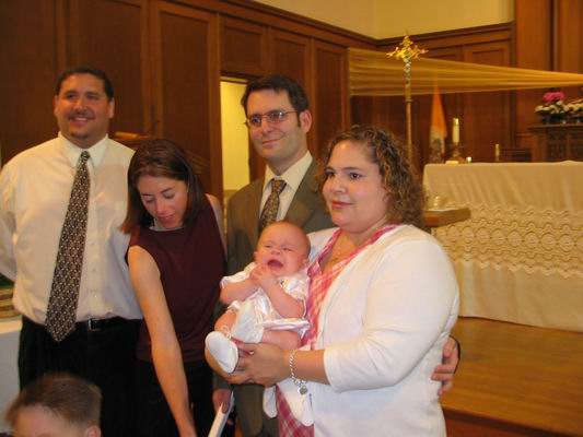 Aidyn Stephen Codori's Christening. L to R, God parents Chris and Annett Pappas and proud mom and dad Greg Codori and Celyn (Pappas) Codori holding Aidynat St Timothy Catholic Church in San Mateo, Calif. 5/16/2004 |
