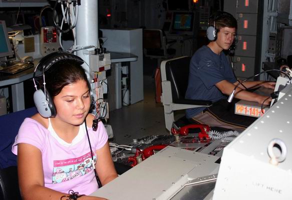 Ally with brother Andy at the controls with cousin Eric and mom Lauren in the background. |