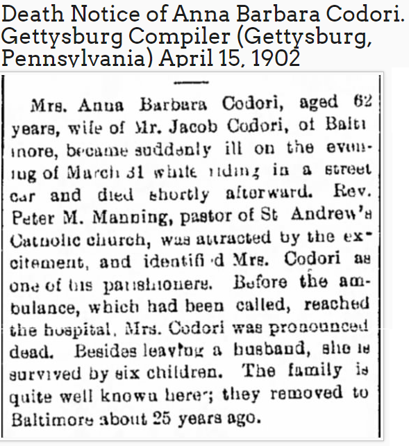 Mary Magdalene Codori, b. October 23, 1858, Gettysburg. Adams Co.,