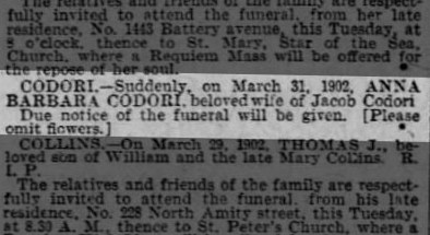 Burial: April 4, 1902, New Cathedral Cemetery, Baltimore, Maryland 21229