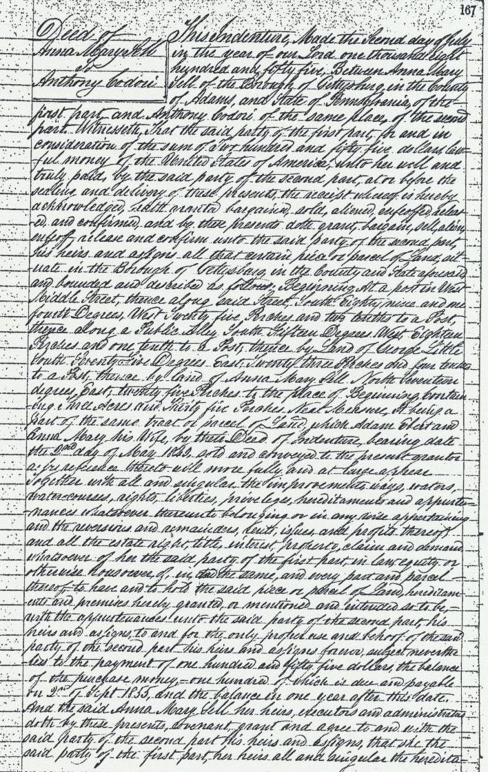 Deed for property in Gettysburg for Anthony Codori 1855.