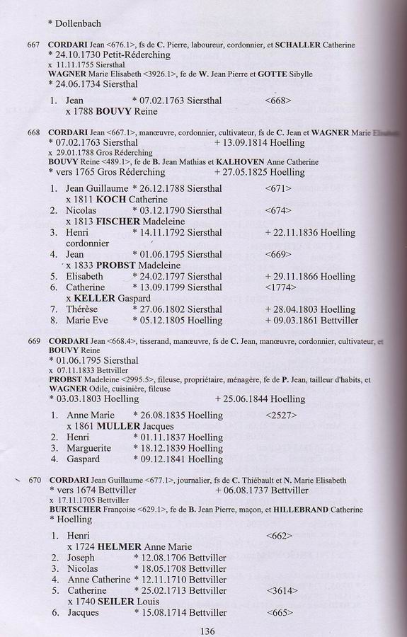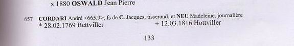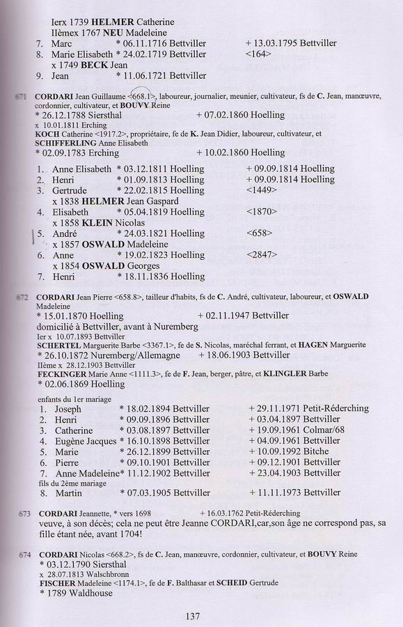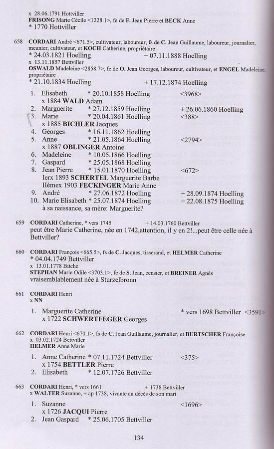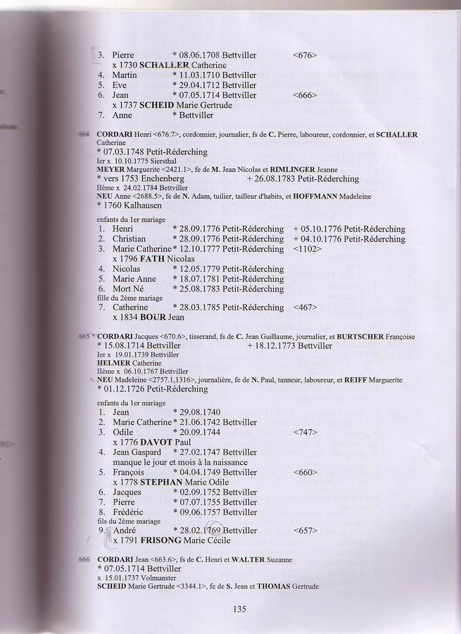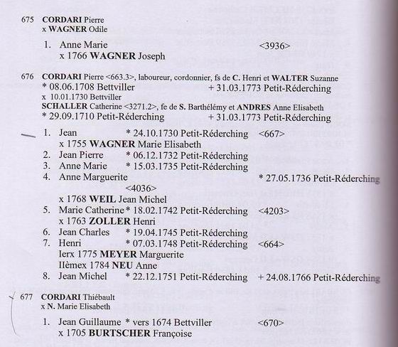 Descendants of Thiebault Cordary 1 Thiebault Cordary +Marie Elizabeth ~ 2 Jean Guillaume Cordary b: 1674 in Bettviller, France d: 06 Aug 1737 in Bettviller, France ~~~ +Francoise Burtscher m: 17 Nov 1705 in Bettviller, France ~~~~ 3 Henri Cordary ~~~~~~ +Ann Marie Helmer m: 1724 ~~~~~~~ 4 Anne Catherine Cordary b: 07 Nov 1724 in Bettviller, France ~~~~~~~~~ +Pierre Bettler m: 1754 ~~~~~~~ 4 Elisabeth Cordary b: 12 Jul 1726 in Bettviller, France ~~~~ 3 Joseph Cordary b: 08 Dec 1706 in Bettviller, France ~~~~ 3 Nicholas Cordary b: 18 May 1708 in Bettviller, France ~~~~ 3 Anne Catherine Cordary b: 12 Nov 1710 in Bettviller, France ~~~~ 3 Catherine Cordary b: 25 Feb 1712/13 in Bettviller, France ~~~~~~ +Louis Seiler m: 26 Jan 1739/40 in Bettviller, France ~~~~ 3 Jacques Cordary b: 15 Aug 1714 in Bettviller, France d: 18 Dec 1773 in Bettviller, France ~~~~~~ +Catherine Helmer m: 06 Oct 1767 in Bettviller, France ~~~~ *2nd Wife of Jacques Cordary: ~~~~~~ +Madeleine Neu b: 12 Jan 1725/26 in Bettviller, France d: 07 Dec 1801 m: 01 Dec 1767 in Petit-Rederching, France ~~~~~~~ 4 Jean Cordary b: 29 Aug 1740 ~~~~~~~ 4 Marie Catherine Cordary b: 21 Jun 1742 in Bettviller, France ~~~~~~~ 4 Odile Cordary b: 20 Sep 1744 ~~~~~~~~~ +Paul Davot ~~~~~~~ 4 Jean Gaspard Cordary b: 27 Feb 1746/47 in Bettviller, France ~~~~~~~ 4 Francois Cordary b: 04 Apr 1749 in Bettviller, France ~~~~~~~~~ +Marie Odile Stephan m: 1778 ~~~~~~~ 4 Jacques Cordary b: 02 Sep 1752 in Bettviller, France ~~~~~~~ 4 Pierre Cordary b: 07 Jul 1755 in Bettviller, France ~~~~~~~ 4 Frederic Cordary b: 09 Jun 1757 in Bettviller, France ~~~~~~~ 4 Andre Cordary b: 28 Feb 1769 in Bettviller, France. d: 12 Mar 1816 in Hottviller, France.