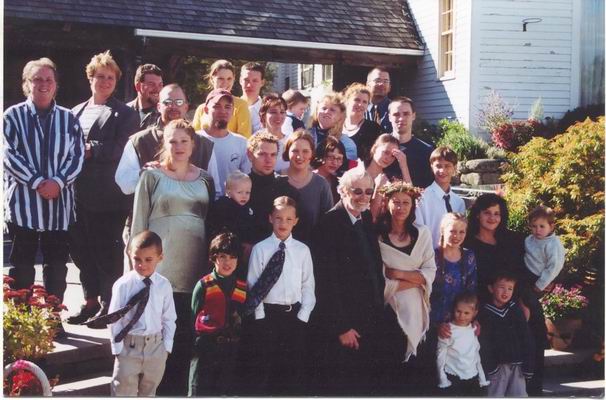 This is a picture Of Bobby Jo (Mini) Codori's family. This was shot at her second marriage to Ron Ford 10/08/2001. Mini and Ron are front row center. Mini has 13 children (two of them adopted) so as you can see, that's why there are so many people in this picture. |