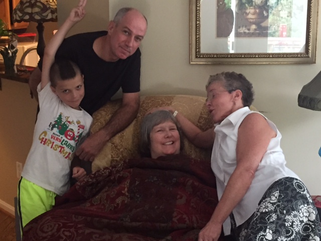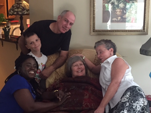 Ann Marie Hartlaub (seated) with Brother John Hartlaub and his son Noah, also Ann Marie caregiver Jemima and Carol Codori on the right.