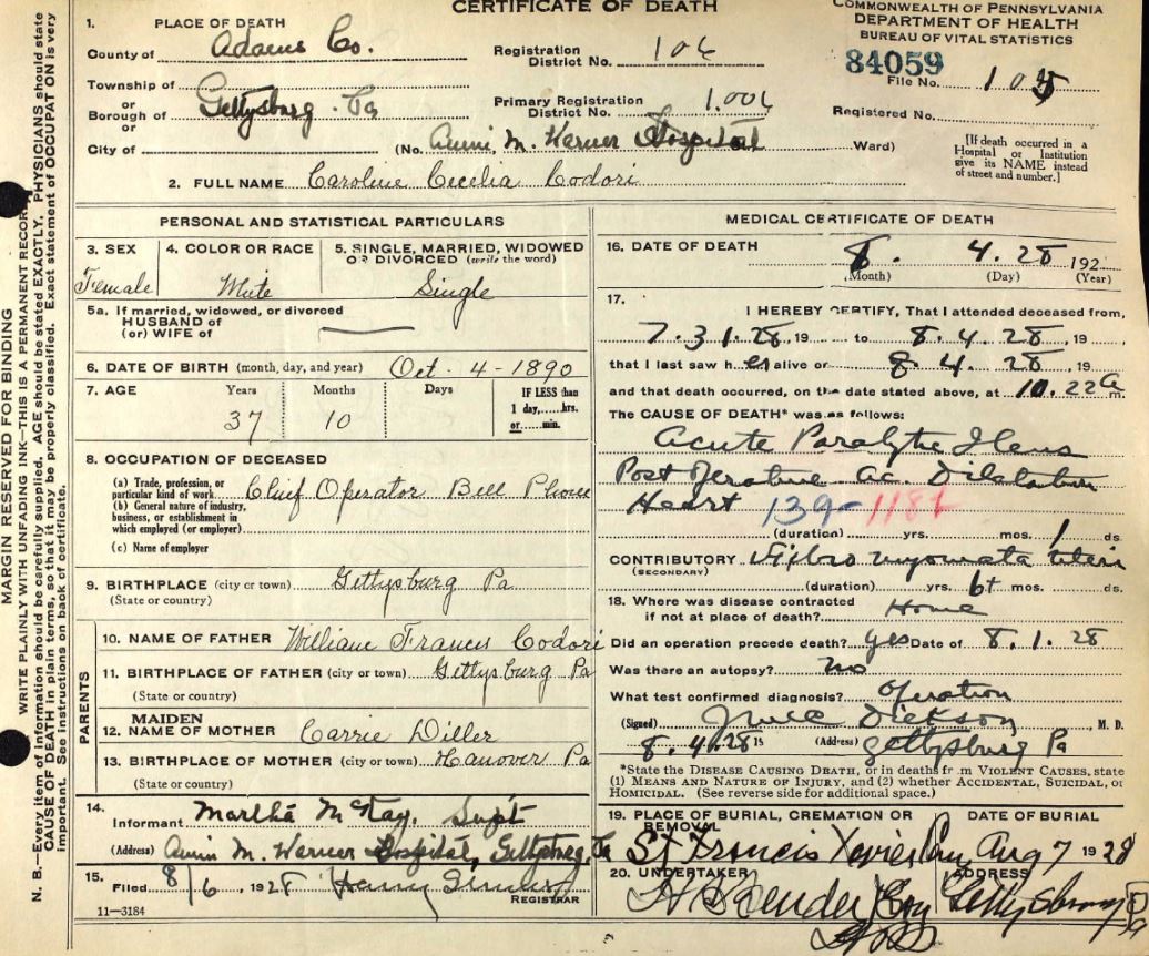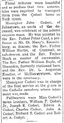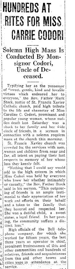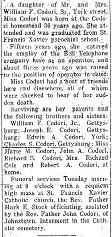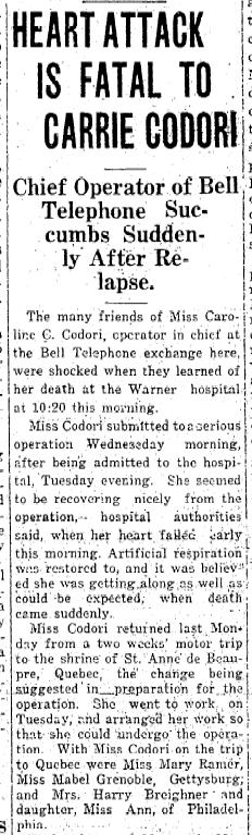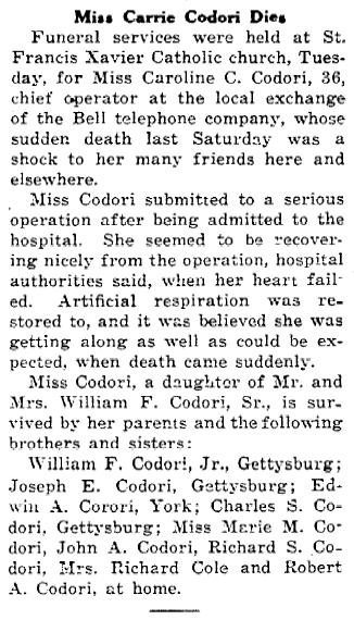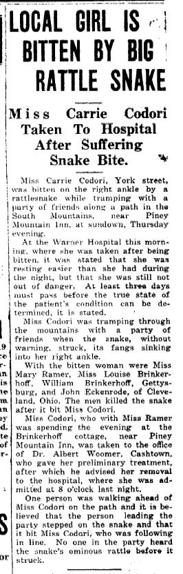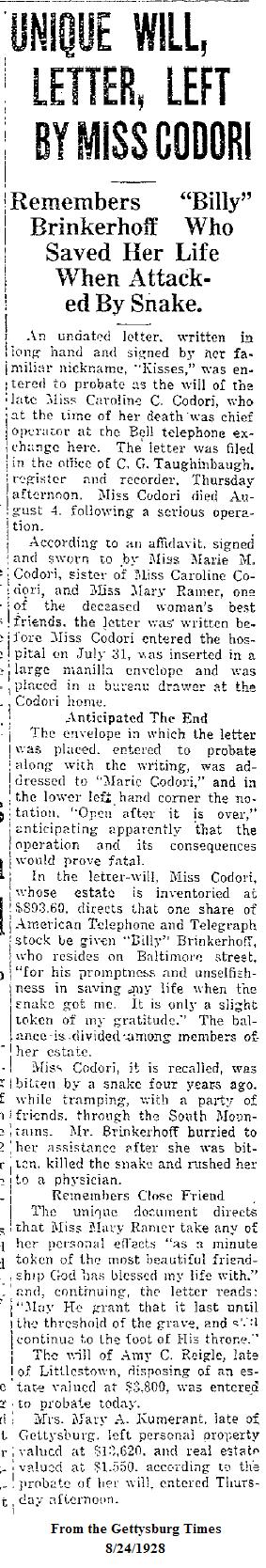 From the Gettysburg Times Sept 19, 1924. The snake bite is mentioned in Miss Codori's will below.