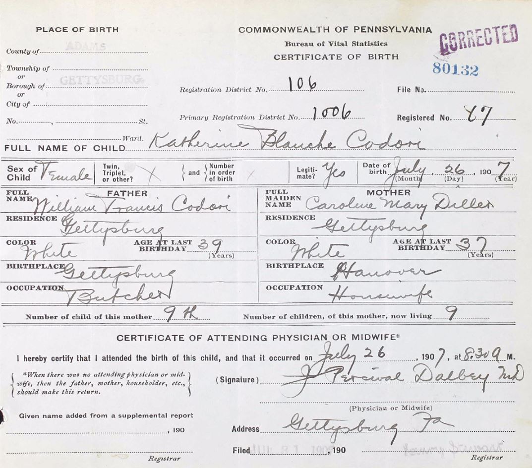 Caroline May Diller) was born July 26, 1907 in Gettysburg, Adams,