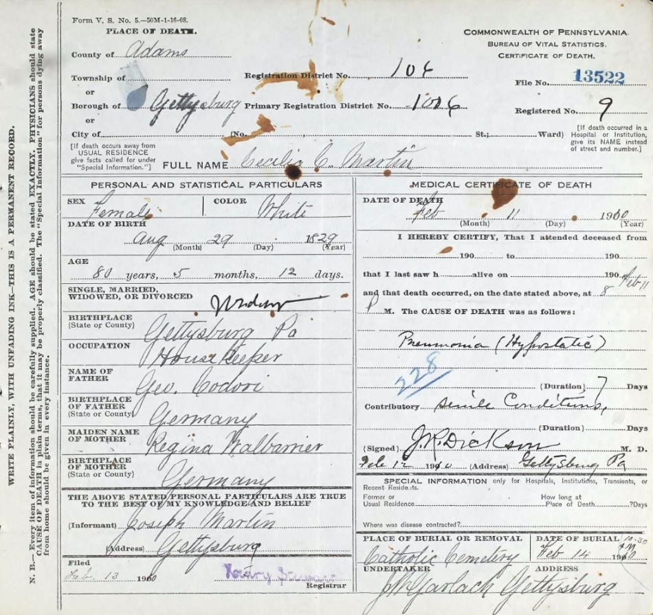 in Adams Co., PA, and died October 25, 1883 in Gettysburg, Adams Co. PA. She