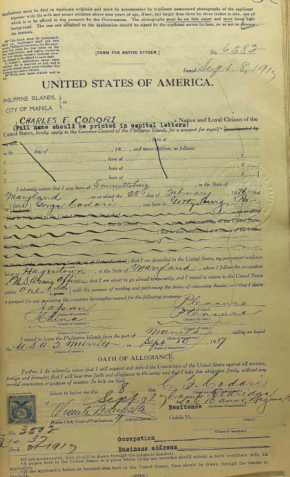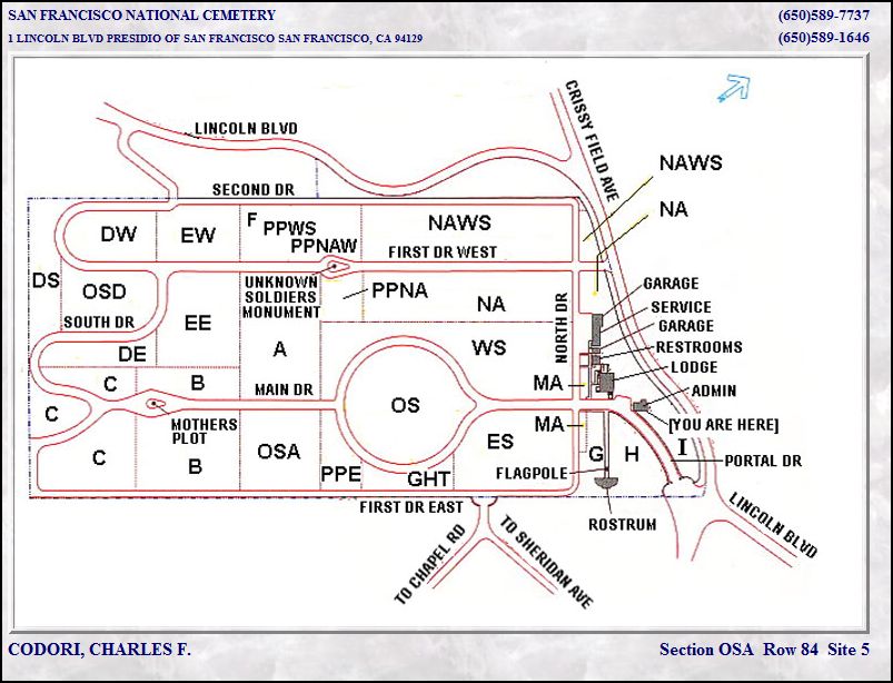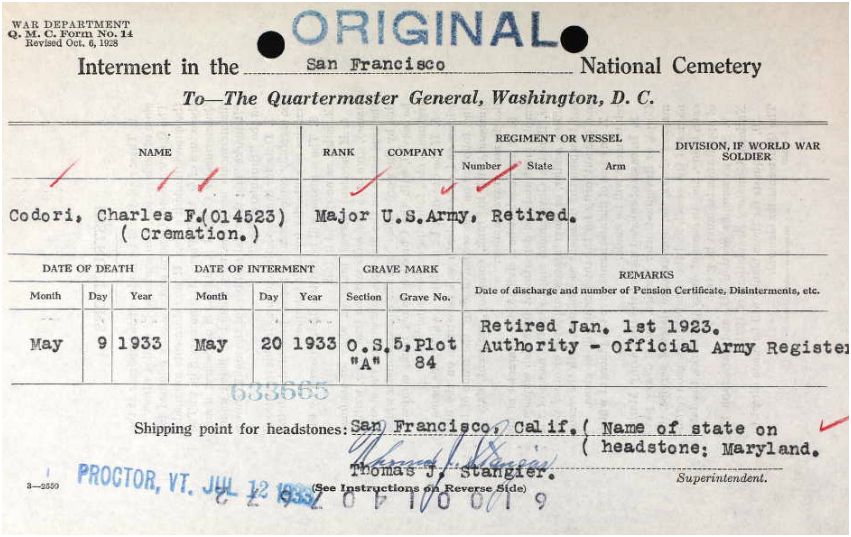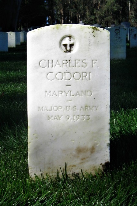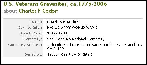 said that Charles was never married. Also, information from Patti Kehler's web site, about 2001. Charles Francis Codori (son of George Joseph Codori and Cornelia Franceanna Florence)70 was born February 28, 1876 in Emmitsburg, PA. Notes for Charles Francis Codori: The following is from a letter written by Ollie Mae Codori: Left home when he was about 15 or 16 years. He joined the army as a drummer boy. He spent 25 years in the Philippine Islands. He retired as a Major. He lived in Maryland then went to Oakland, California with Cornelia and Ollie Mae around 1922. George J. followed and moved in with them a few years later. Charles health began to fail, so he set up a house for Cornelia, George & Ollie Mae in San Bernardino. He traveled, went back to San Francisco. He also had a home at Lake Tahoe. His health got worst. He set a trust fund up - George was to take of it: also said Maggie and George would get all of his estate. " When he died the nurse had gotten him to change the will a few weeks before he died. So all his folks got was the trust fund. They didn't even know he was dead for over a month. When George saw him about six months before he died he gave him a copy of the will. When I heard about it I told them they should contest the will. They didn't have a lot of money I tried to talk them into getting a lawyer on a percentage. They felt it would be wrong so just said the guy would pay for his sin later." Charles was cremated and the ashes were dropped over the Golden Gate Bridge, but there is a grave marker in the Presidio Cemetery & one in Arlington National Cemetery, Washington, DC.He never married. Was a 33rd Mason. Maryland in the World War 1917-1919: Military & Naval Service Records, Vols. I & II Serbian, Order of St. Sava: Charles F. Codori: Address: Hagestown, Washington Co., Birth Place: Emmitsburg, MD Birth Date: 28 Feb. 1876 Comment: RA 1 Lt Philippine Scouts; capt Philippine Scouts 4/2/18 maj Ing; RA 9/30/19 capt Philippine Scouts, 7 Bn Philippine Scouts; Adj 3 Off Tng School Ft. McKinley P.I. 12/22/17; Co B 1 Prov Engrs (Philippine) 8/8/18; 2 Bn 3 Prov Inf (Philippine) 9/6/18; Asst Insp Philippine Dept 6/14/19, Retired 10/15/19. More About Charles Francis Codori: Burial: Cremated: ashes dropped over the Golden Gate Bridge, California. |