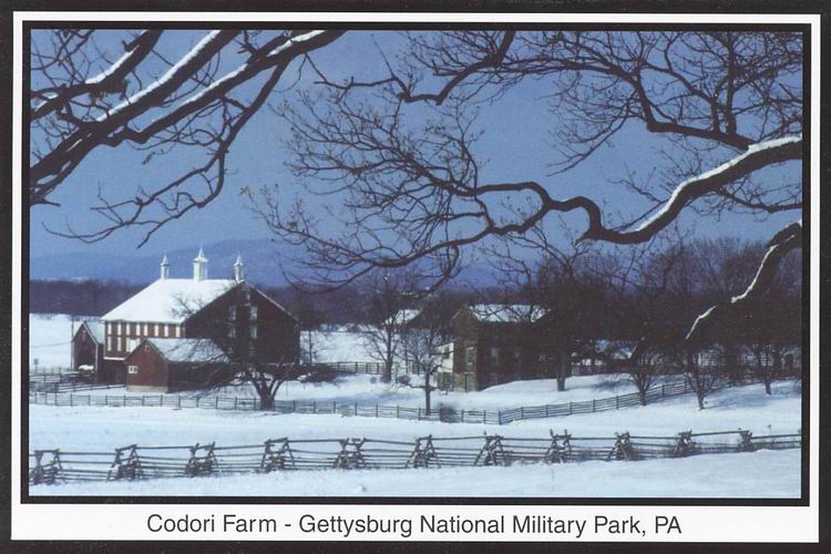 One of the best shots of the Codori farm, this is from a post card that was bought in Gettysburg November 2002. The photo was taken by Laverne Louey in 1990 …. Great shot. |