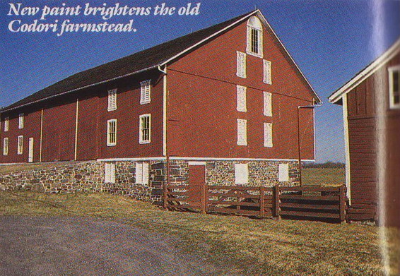 From Country Living Magazine Feb. 1988 a shot of the Codori barn with fresh paint but before cupolas were reinstalled.