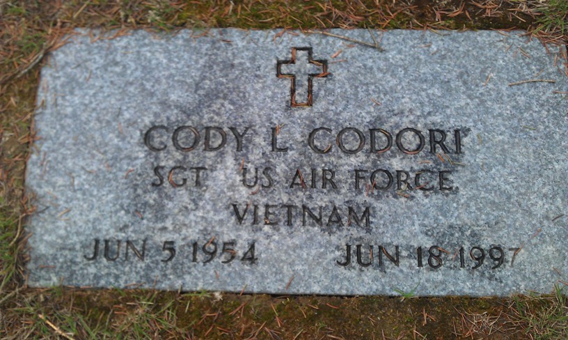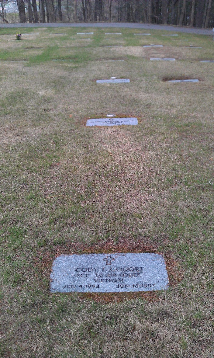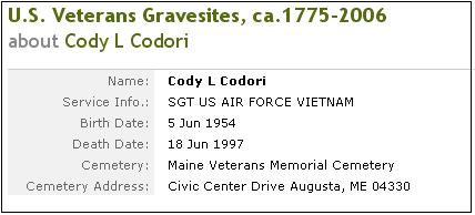 From: Providence Journal - Bulletin. Providence, R.I.: Jul 9, 1997. pg. D.06 CODY L. CODORI, 43, of Hallowell, Maine, a disabled Air Force veteran of the Vietnam War, who attained the rank of sergeant, died June 18 at home. Born in Las Vegas, Nev., he was a son of Donald Codori of Cranston and the stepson of Norma Codori of Cranston. He was a graduate of Johnston High School. Mr. Codori was a Master of Tai Chi. He was a volunteer at the Togus Veterans Hospital in Maine. He was a member of the American Civil Liberties Union and a life member of the Disabled American Veterans. Besides his father and stepmother, he leaves two sisters, Mini Galloway of Cranston and Diane Guilbault of Johnston. Burial with military honors was in the Maine Veterans Memorial Cemetery in Augusta, Maine. |