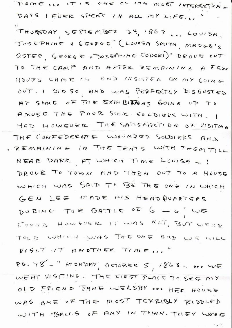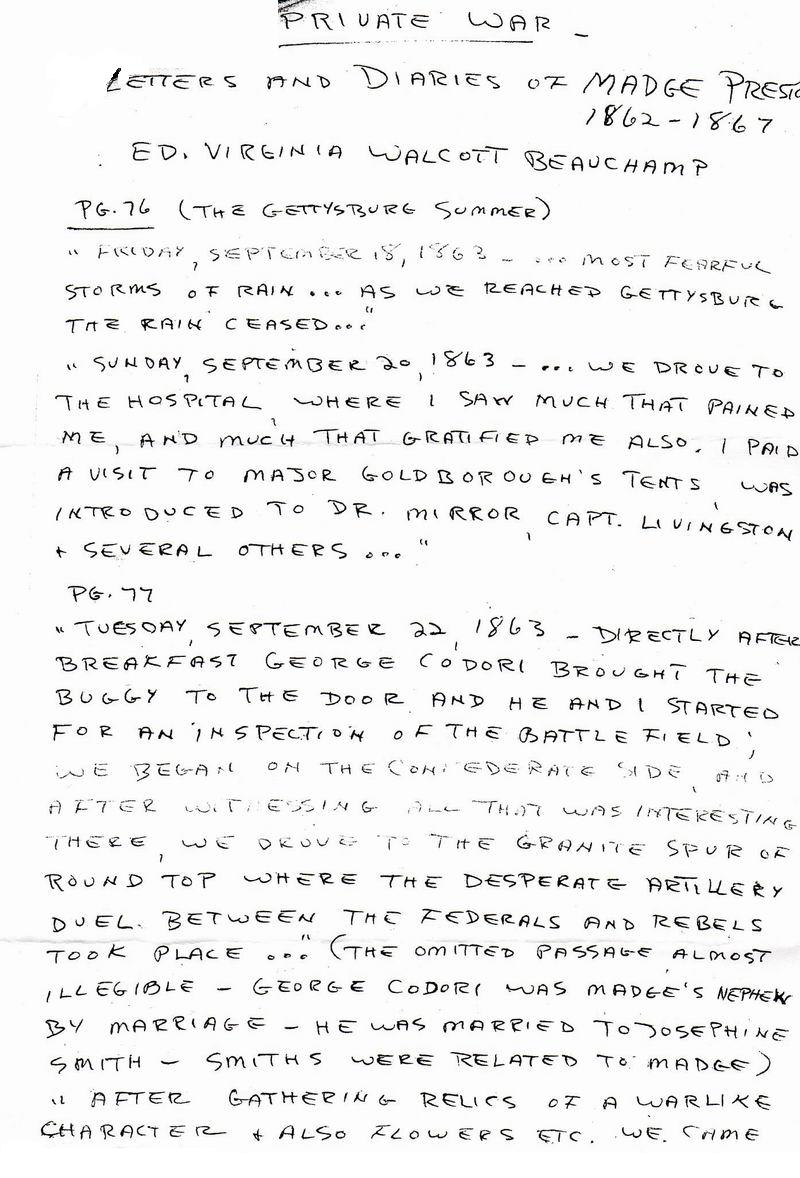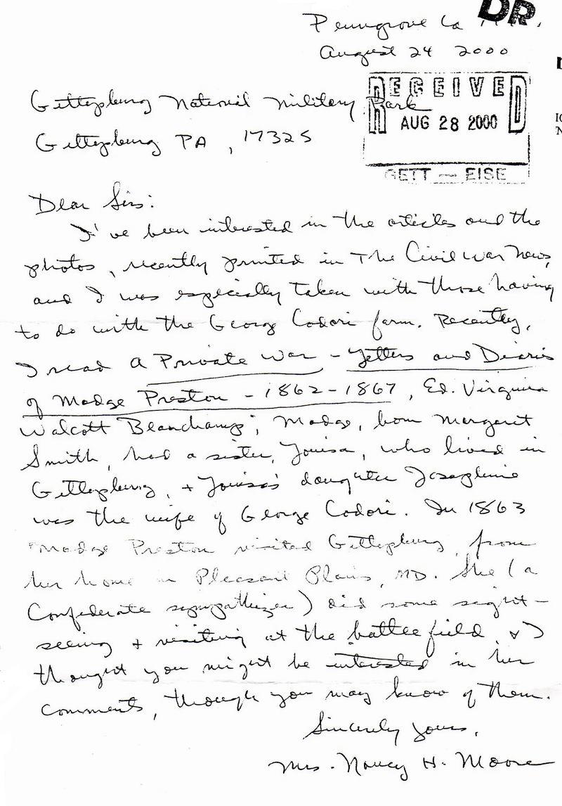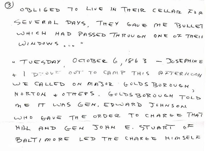 A note to those who were at the dinner and for those who heard the Colonel say it was the farm owned by George Codori he was only half right. I thought the George he mentioned was Jean George Codori, Nicholas's brother and civilian POW, but the George in the letter is the son of Nicholas Codori and the Josephine mentioned would be George's wife. George A. Codori was born in Gettysburg, PA. 11/30/1835. |