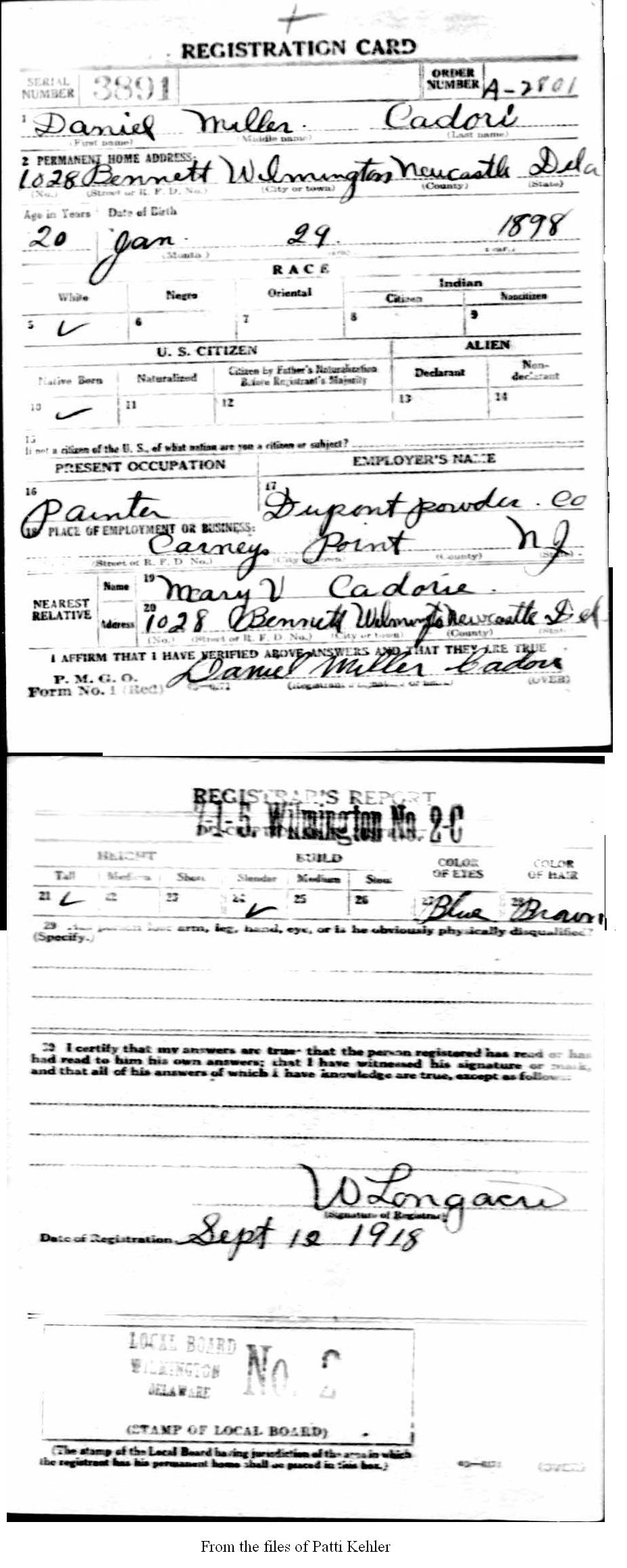 Patti Kehler's web site, about 2001. Daniel Miller Codori (son of George Joseph Codori and Mary Velesia Stevens) was born January 29, 1898 in Baltimore, MD80, and died December 1962 in Wilmington, New Castle, Delaware. He married Marie B.. Notes for Daniel Miller Codori: No children. Mary Stevens Codori and Novelle Stevens lived with them. More About Daniel Miller Codori: Military service: WWI Civilian Draft registration - Wilmington, Del.. Occupation: Works in Carneys Point, NJ. Residence: Wilmington, New Castle, Delaware. SS Number: 221-01-2302 |