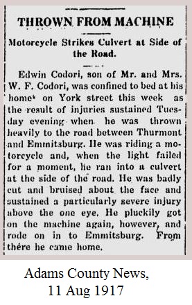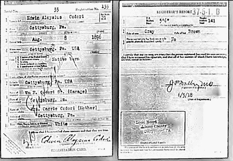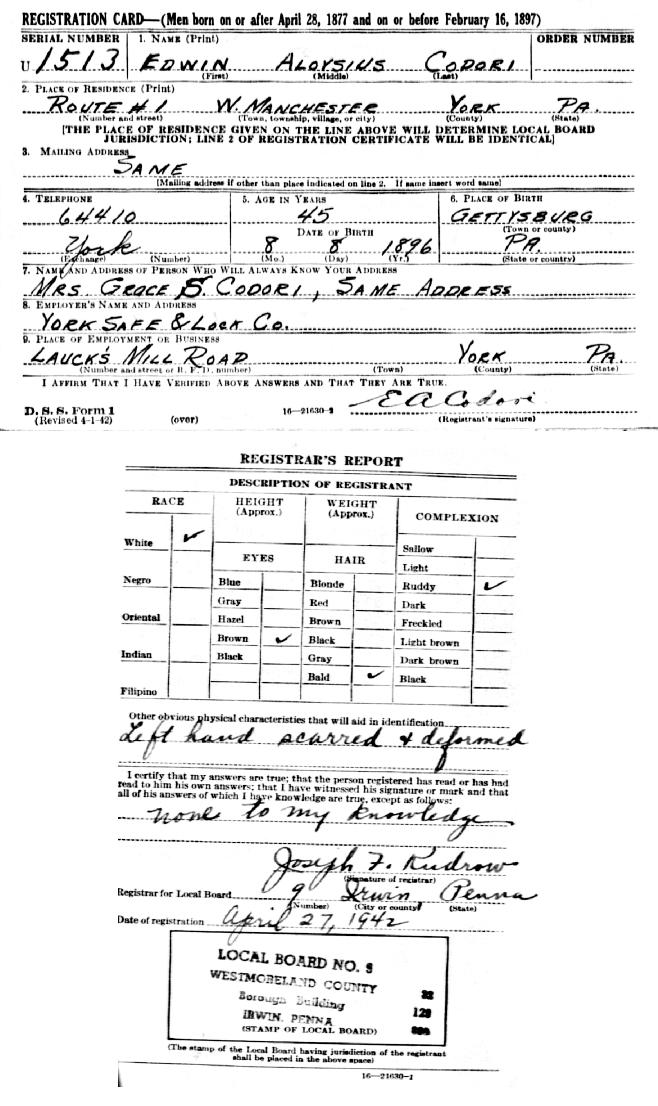 Mr. Codori was born in Gettysburg, August 8, 1896, a son of the late Wailliam F. Codori Sr. and Carrie M. Codori, 44 York St. He graduated from the local parochial school and for most of his life was an auto mechanic. He has been a resident of York for 45 years.