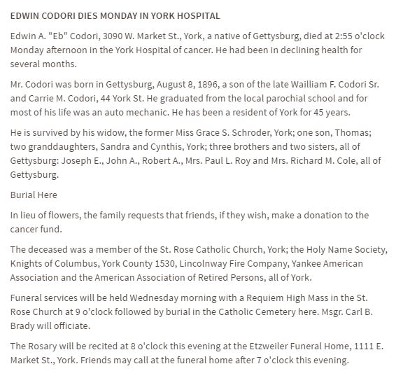 Edwin A. "Eb" Codori, 3090 W. Market St., York, a native of Gettysburg, died at 2:55 o'clock Monday afternoon in the York Hospital of cancer. He had been in declining health for several months.