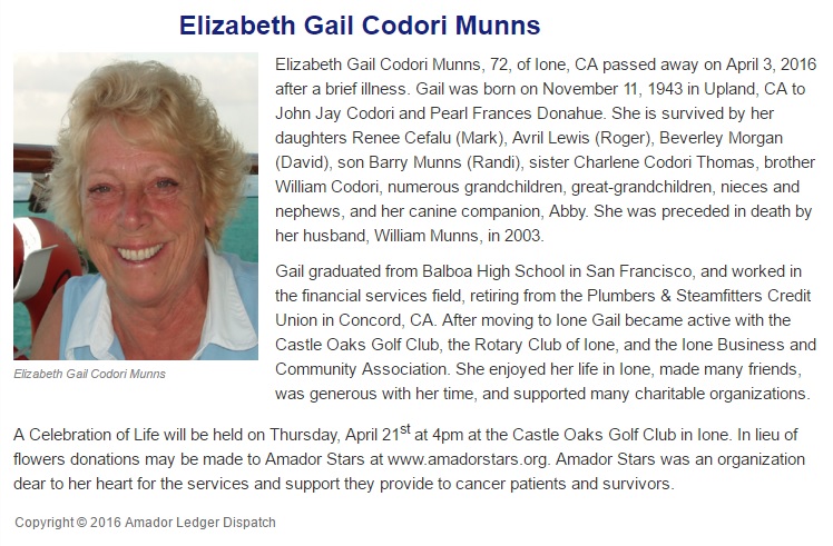 Elizabeth Gail Codori Munns lives in Ione, Calif. Ione is a small town in the gold country of Calif. Gail, as she is called by family and friend, is quite a golfer and was more than happy to travel to England and Ireland with her late husband, William K. Munns, years ago just to check out the golf courses there. |