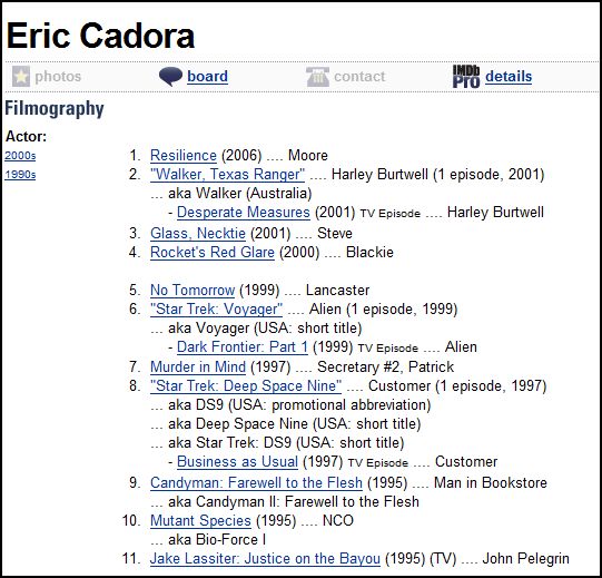 Eric is a Codori descendant but his grandparents changed the Codori name to Cadora. Eric's father is, Albert Stevens Cadora. Click here to read the story of the name change on Albert's page. About Eric, he has appeared in many movies and TV movies. The picture above is from the movie "Glass Necktie". |
