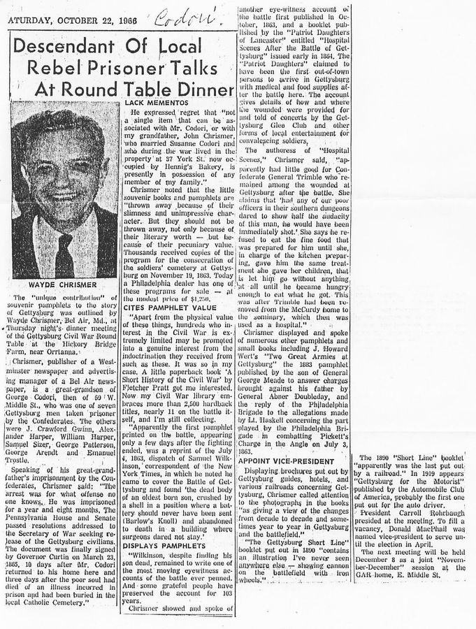 Emmitsburg Area In the Civil War Wayde Chrismer Overview Mention the Civil War and most Americans will think first of the Battle of Gettysburg. Probably not one in a million, however, knows that but for the grace of God and the ifs and accidents of all military campaigns, the most famous battle in American history would have been The Battle of Emmitsburg, and Gettysburg merely an obscure town to the north from which Lee’s Confederates descended upon Emmitsburg-based Yanks in an inexorable step towards Baltimore and Washington, primary objectives in their 1863 invasion of the North. It’s an historical fact, however, to be spelled out in detail later. The most controversial phase of American history is its Civil War. More words have been written about it than all other eras put together. The most difficult state about which to determine the true picture is Maryland. For twenty years this writer has researched that particular subject without reaching a provable conclusion as to whether the state was pro-North or pro-South. "Facts" are available about nearly every Maryland aspect. But turn another page. read another book, pamphlet, newspaper, contemporary letter, diary or post-war memoir, and you find those ‘‘facts’’ contradicted, or at least disputed, by a source equally as reliable as the first. But where can you find out much that is worthwhile and reliable al) out Emmitsburg? Rarely were the voluminous records on the war broken down even to counties; to towns, never. No newspaper existed in Emmitsburg; nobody seems to have kept anything remotely resembling a diary; not a single letter by a resident Emmitsburgian during the war has been found. A few are recorded in The Story of the Mountain. Helman’s History of Emmitsburg appears to be based largely on hearsay, and occasionally the town is mentioned in the Official Records or some soldier’s unreliable post-war memoirs. The only newspapers one can use are Frederick ones, of which there were three during the period. The writer is fortunate in possessing a complete file of The Frederick Examiner for the years 1844 into 1863 (a gift of the late Charles Arthur Elder). Of the other two. The Republican Citizen (actually Democrat as to politics) and The Maryland Union (a mixed political breed) only occasional scattered issues apparently exist not enough to be any more than troublesome. Williams in his History of Frederick County describes them well, saying "the papers were filled with editorials of a most intensely partisan character . . . . The subscriber to The Republican Citizen was almost sure to be a Democrat, and the circulation of The Examiner was confined practically to the Whigs" [later it would support the "Americans" (or Know-Nothings) and eventually the "Unconditional Unionists" (or Republicans).] Williams went on: "Each subscriber believed what his paper stated, absolutely refusing credence to the paper of opposite politics. If there was a great political meeting, the editor was there in person to report it, that is if it was of his own party. If it was of the opposite party, it would be dismissed with a few contemptuous lines." The papers, for instance, would not even publish the names of candidates of the opposition parties until the results of elections were announced. Add to this the fact that Emmitsburg was the most remote county town from Frederick and was rarely mentioned; the papers had no "reporters" except friends who dropped in to "report" what they knew the editor wanted to hear few of them being from faraway Emmitsburg, and you can appreciate an Emmitsburg historian’s problems.