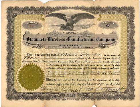 | Beautifully engraved certificate from the Steinmetz Wireless Manufacturing Company issued in 1922. This historic document has an ornate border around it with a vignette of an eagle. This item is hand signed by the Company’s President (Fred Steinmetz ) and Treasurer and is over 80 years old. |