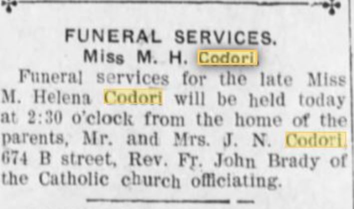 Three sister, Kate and Helena Codori were born in Gettysburg, Pa. (1883 & 1884) and younger sister Irene Codori born 1896 in San Bernardino, Calif.