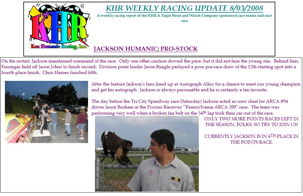 Jackson Humanic of Titusville is the 13-year-old son of Pro Stock car owners Ken and Chris Humanic. In 2004, Gerry Bruce of Franklin won five feature races and the track championship for the Humanics. This season, Bruce and the Humanics started a different venture in the USAR Hooters Pro Cup Series. Even with the decision to move to asphalt racing, their title-winning Pro Stock still sat in the garage. That is, until young Humanic was tabbed for the ride.
