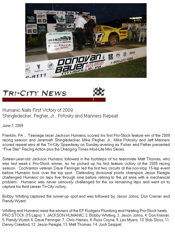 Young racers have to start somewhere. Even Jeff Gordon raced a sprint car at Tri-City in 1985 at age 14. For Humanic, the Pro Stocks at Tri-City may only be the beginning.