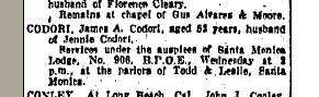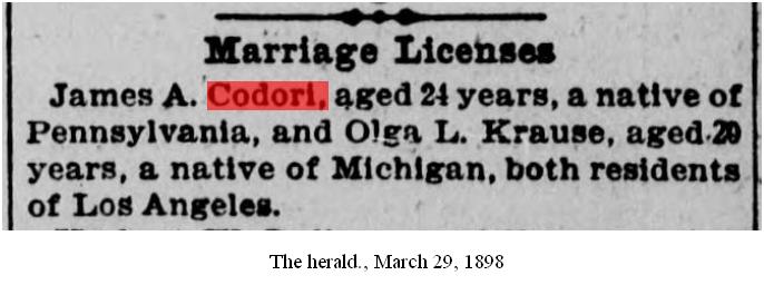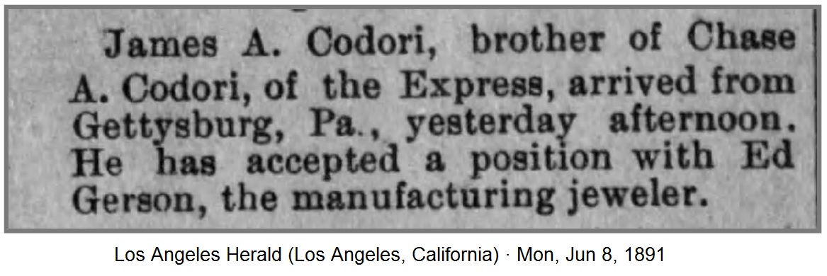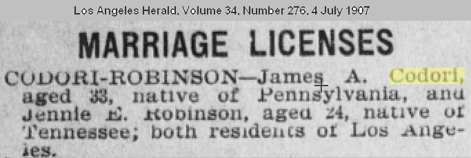 Death notice of James A. Codori. It should be noted that at his time of death he was married to a Jennie Codori.