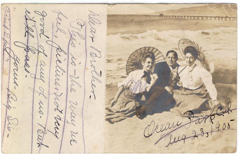 Post card send to August Krause, in Howell Michigan from his sisters Olga and Pauline (Both pictured above). James Codori center. Taken at Ocean Park at or near Pasadena, Calif.