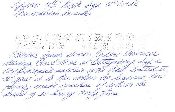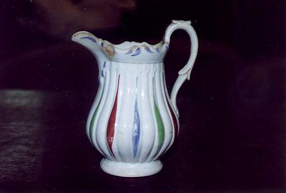 Below is part of a letter from Janet telling the short story of the pitcher. >>>>I took a picture of a small pitcher that was given Susan Codori, my great grandmother during the Civil War. It was given her by a Confederate soldier who had looted it somewhere. She, as the story goes, was in the basement, holding infant Charles, my grandfather, as the soldiers came in. One was aware of the fine carriages that the Codoris made and gave her the pitcher which I have. <<<<