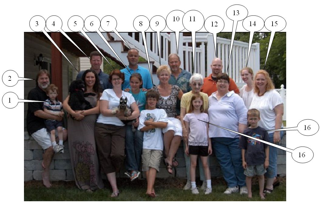 Jeannie Chrismer Shoop 10 Larry Shoop 11 Jane Chrismer 12 Mike Brown 13 Becky Chrismer Brown 14 Becca Corbell 15 Matthias Buchheister 16 Elizabeth Buchheister