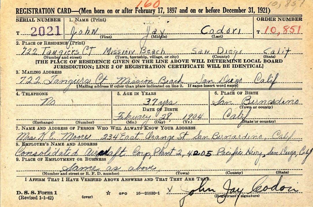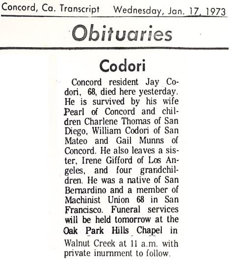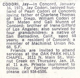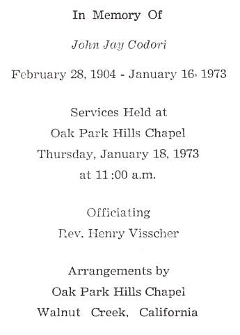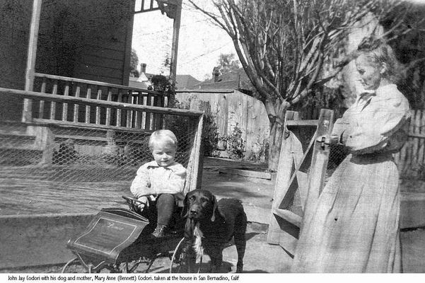 J.J. Codori with third and final wife. John Jay Codori and Pearl Frances Codori at Bill Codori's wedding 7/10/1965 in San Francisco, Calif. J.J. Codori with his mom Mary Anne Codori in front of their San Bernardino home.![]() |