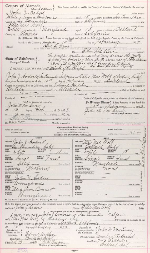 John Jay Codori with his first wife Ollie Mae Wolfe of San Bernardino, Calif.