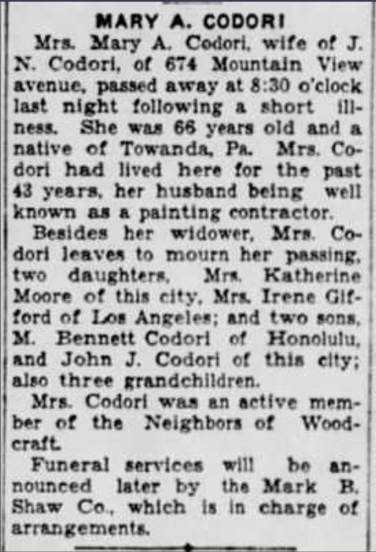 Mary Anne (Bennett) Codori was born in Towanda, Bradford, Pennsylvania 1862 |