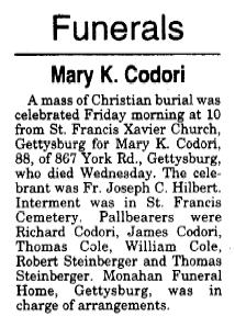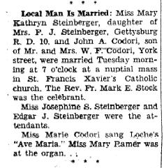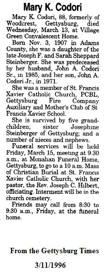 Caroline May Diller. Newspaper with John A. Codori Death Notice - Dec. 21, 1971 has Mary's maiden name as Steinberger. More About Mary Kathryn Stemberger: SS Number: 176-44-2285. More About Mary Kathryn Stemberger and John Augustus Codori: Marriage: November 19, 1929, Gettysburg, PA. |