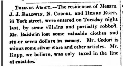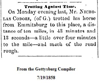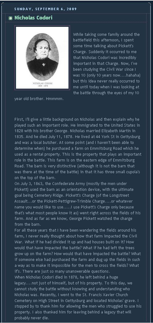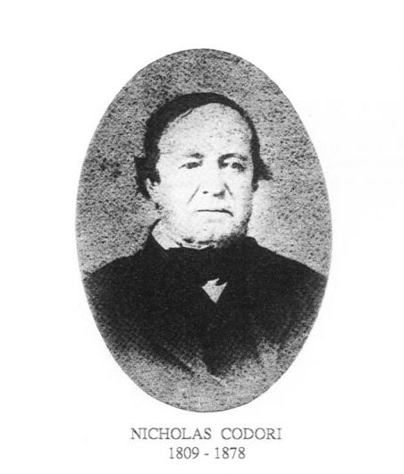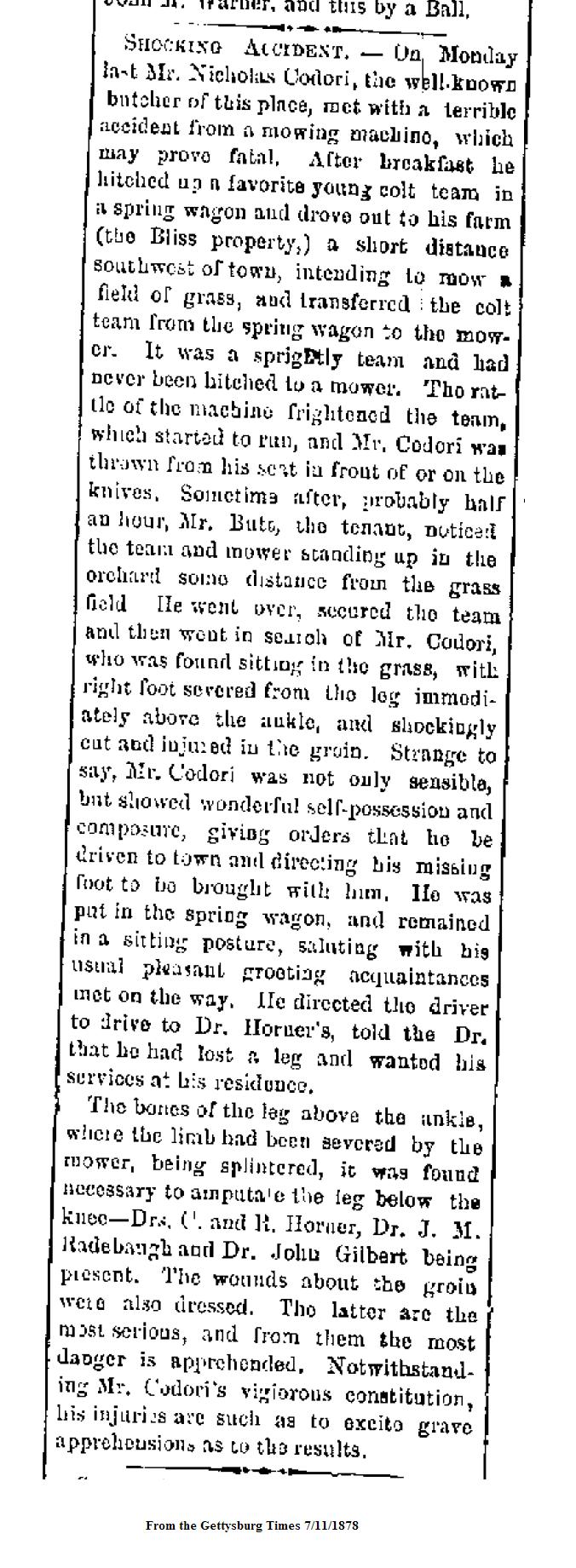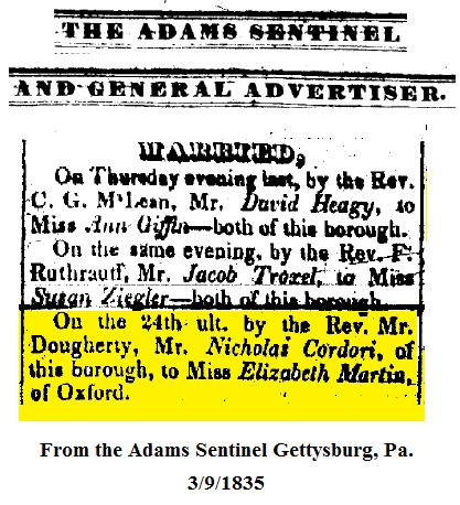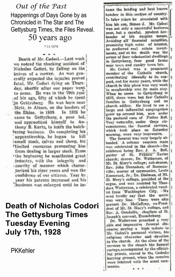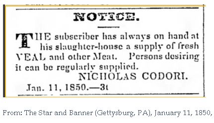 Story off the Internet Also information from Patti Kehler's web site, about 2001. Nicholas Cordary (son of Andre Cordary and Marie Cecile Frisson)325 was born May 29, 1809 in Hottviller, Dept. Munster, France326, and died July 11, 1878 in Gettysburg, Adams Co., Pennsylvania - 69 yrs., 1 month, 12 days old327. He married Elizabeth Martin on February 24, 1835 in By Rev. Father Doughtery328, 329. Notes for Nicholas Cordary: "Died July 11, 1878 in this place. Nicholas Codori aged 69-1-12 - Mr. Codori was born near Metz - in Alsace on the border of the Rhine, in 1809. In 1828 He came to Gettysburg, Pa. & apprenticed himself to Anthony Kuntz to learn butchering business & completing his - apprenticeship he went into business for himself. In later years his son Simon J. Codori was associated with him. Mr. Codori was a member of the R.C. Church - Buried in R.C. Cemetery." (see folder) (Information from the Adams County Historical Society Library) Brought 44 York Street home from Robert King in 1843, the home remained in the family until it was purchased by Dr. Miller in 1967. The home was used to house soldiers and welfare organizations during the Civil War. One 2nd floor room served as a chapel for a Catholic chaplain on duty during the Battle of Gettysburg. James Gettys was the original owner until he deeded it to Michael Hoke in 1787, Henry Hoke became its owner in 1796. Robert King purchased the home in 1838. (see folder) The original deed is in the possession of the William F. Codori heirs. It is one of the oldest and the most unique dwellings in Gettysburg. NICHOLAS CODORI & JOHN CHRISONER & JOSEPH MARTIN TO ADAM ERTLER, DEED CUMBERLAND TWP. 1865. ACHSL (CARD FILE) NICHOLAS CODORI TO SAMUEL WOLF, DEED BOROUGH OF GETTYSBURG, 1867. ACHSL (CARD FILE) NICHOLAS CODORI FROM HENRY BARBEHEN, DEED. BOROUGH OF GETTYSBURG. 1876. ACHSL (CARD FILE) NICHOLAS CODORI, FROM ANDREW POLLY, DEED. BOROUGH OF GETTYSBURG, 1848. ACHSL (CARD FILE). NICHOLAS CODORI, TO HENRY BARBEHEN, DEED. BOROUGH OF GETTYSBURG, 1872. ACHSL (CARD FILE) NICHOLAS CODORI, DIED 11 JULY 1878, GETTYSBURG, PA. 69 YEARS, 1 MONTH, 12 DAYS. 18 JULY SENTINEL ACHSL (CARD FILE) "ADAMS COUNTY, SS. - SIMON J. CODORI WHO, UPON ;HIS SOLEMN OATH, DOTH DEPOSE AND SAY, THAT NICHOLS CODORI, ON WHOSE ESTATE LETTERS TESTAMENTORY ARE APPLIED FOR, DIED ON THE 11TH DAY OF JULY 1878, AT 11O'CLOCK A.M. OF SAID DAY. SIGNED BY SIMON J. CODORI AT GETTYSBURG, THE 15TH DAY OF JULY, 1878 REGISTER." (COPY IN FAMILY FILE) ACHSL. (1000 CODORI FAMILY) Bill Codori - Ancestry World Tree (11/22/98) has birth date listed as 29 May 1809. Adams County Historial Society Library: Nicholas CODORI, died 11 July 1878, Gettysburg, Pa. 69 years, 1 month, 12 days. 18 July Sentinel ACHSL (Card File) Other way of spelling Codori in France: Kortari, Emigrated to America in 1828 at the age of 19 years. (Catherine Coles) Newspaper Clippings: (source: Catherine Codori Cole) "1868: Nicholas & Simon Codori have fitted up in excellent style a commodious building on York St., a few doors from the Globe Inn for a meat market. The Messrs. Codoris are first class butchers and everything they offer is the best that can be had. 1867: Nicholas Codori, butcher, slaughtered a hog the other day which weighed 566 pounds, the heaviest of the season. Mr. Codori purchased it at Littlestown, Penna. 1867: Ex-sheriff Wolf has purchased 5 acres of land on the York Turnpike from Nicholas Codori for $650. 1890: Nicholas Codori sold his farm on the York Turnpike to Shepherd Stauners of Baltimore 97 1/2 arces for $4,900 cash." The St. Francis Xavier Church served as a hospital for the wounded until September 1863. Many of the wounded required amputation, medical authorities determined that the victims of the conflict were too critical to be moved before this date. No Mass service was held during this period not until January of 1864 when repairs were completed to the church from the extensive damage done. Nicholas Codori offered his home at 44 York Street for Mass services. Citizens and soldiers jammed into the home and used the descending staircase for services from July 1863 to January 1864. The masses were celebrated by Father A.M. McGinness, the parish pastor in 1863. (For God & Country St. Francis Xavier Church 1831-1931, pages 22-23. Nicholas Codori was one of the original parishioners of the St. Francis Xavier Church. (For God & Country St. Francis Xavier Church 1831-1931, page 4) Gettysburg Times: July 11, 1878 "Mr. Nicholas Codori after breakfast one morning, hitched his lively young colt team to a spring wagon and drove to his farm. The Bliss property adjacent to the Codori property on the Emmitsburg Road. New Jersey & Confederate troops fought around the Bliss property prior to the Picketts Charge. The house changed hands several times and eventually was burned by the Union troops. Mr. Codori planning to mow, transferred his colts from the wagon to the mower. The noise of the blades frightened the colts and Mr. Codori was thrown from his seat in front of the blades. He was found about a half hour later, his right foot was severed from the leg above the ankle, shockingly cut and injured in the groin. He was sensible and gave orders to be driven to town and his severed foot to be brought along with him, he remained in a sitting position and greeted acquaintances along the way. Dr. Horner amputated below the knee, because the bones were badly splintered. His groin injurious were serious and proved fatal. He died the following week. he was in his 70th year. Fifty of them spent in Gettysburg. In 1828, he came to Gettysburg and apprenticed himself to Anthony B. Kuntz to learn the butchering business and was the leading and best known butcher in this section. His son, Simon J. Codori was his successor and also owner of four substantial dwellings, four good farms near town and sundry lots. July 18, 1878" (source: Catherine Codori Cole) More About Nicholas Cordary: Ethnicity/Relig.: Roman Catholic. Immigration