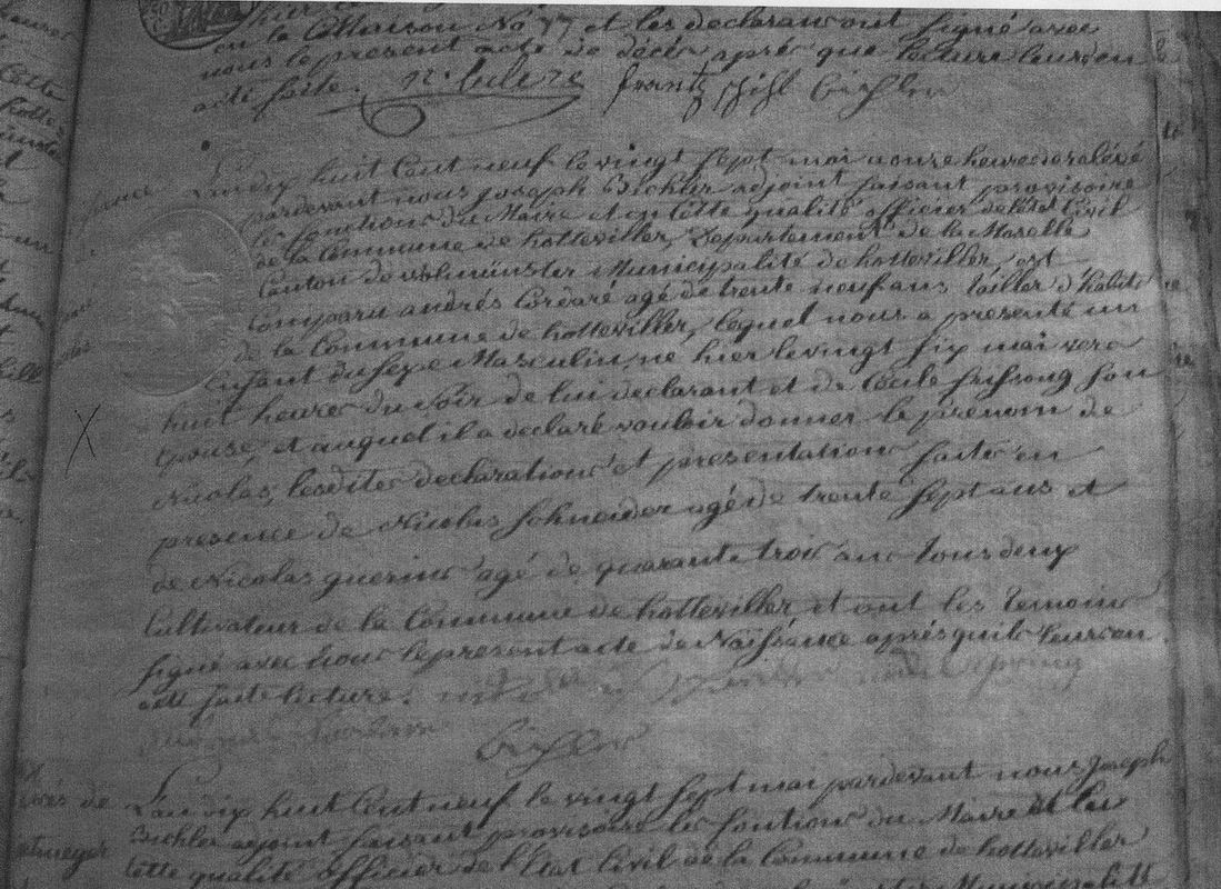 Birth certificate from Hottviller, France Courtesy of Sandrine Dehlinger of Metz, France.
