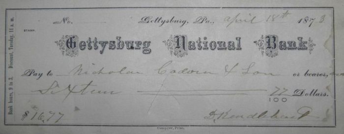 Ebay item: A check to Nicholas for $77. in 1873. |