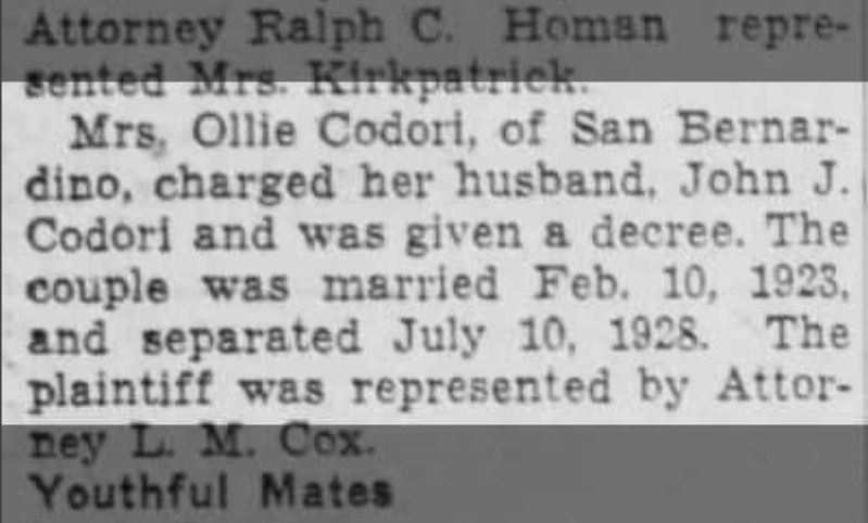 John Jay Codori and Ollie May Wolfe. Ollie was the daughter of Margaret (Codori) Voce of San Bernardino, Calif. Ollie May was John Jay's niece (1st cousin once removed) even though they were very close in age. Ollie Mae was also the first wife of John Jay Codori. Ollie took the name Wolfe since that was the family that took her in after Margaret gave birth to her (illegitimate). |