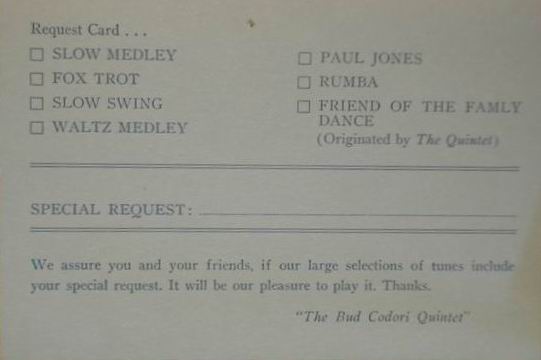 Hap Wolf (tenor sax), Archie Moul (trombone), Robert Codori (vocals), Niles Nace