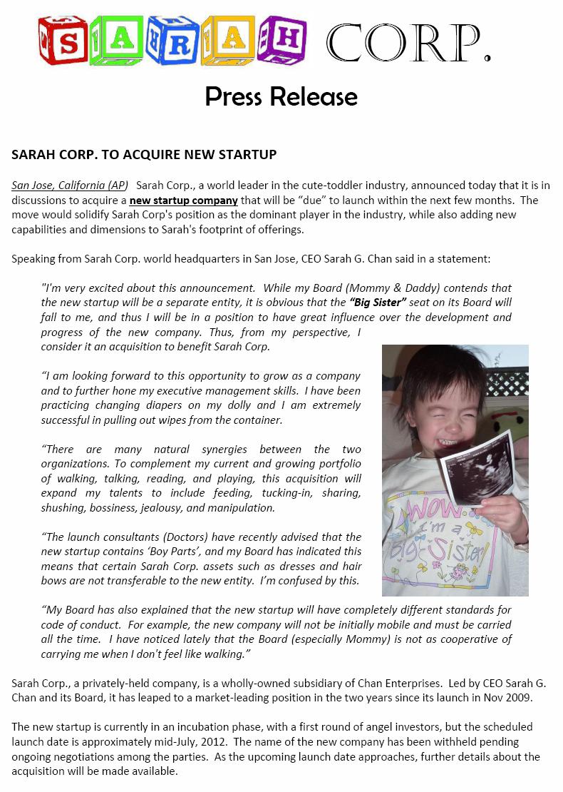 I welcome any investors who would like to visit me at Corporate HQ. Please contact my Admin staff (aka the Board) and they will be happy to accommodate you, if I am not sleeping, eating, or otherwise occupied. Respectfully submitted, Sarah G. Chan, CEO