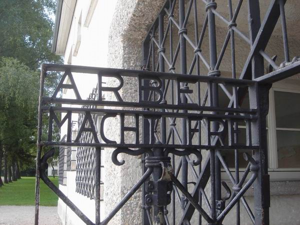 Gates, at the entrance to Dachau (Work will make you free) |