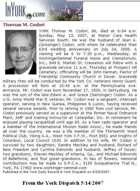 84-year-old hangs up his racquet Pacemaker keeps him from playing the game he loves Those who saw him on the court knew his game. Tom Codori kicked butt on the racquetball court, besting men nearly half his age. But now, at 84, Codori received the stop-that-it's-bad-for-your-health talk from his doctor. So, 32 years after retiring from work, Tom has retired his racquet, quit playing and taken a seat on the sidelines. No more Wednesday nights with the guys on the racquetball court. His doctor told him if a racquet or ball hit him in the chest, it could cause problems with his newly installed pacemaker. He and Jean Codori, his wife of 62 years, sat in recliners in the living room of their Oatman Street home near Kiwanis Lake the other day talking about the sport they love and those life-altering physical ailments that prevent them from playing -- well, racquetball anyway. "No contact sports," Tom said. "That's what stopped me -- doctor's orders." Arthritis stopped Jean from playing. She quit 10 years ago, when she was 70. But she hung on to the racquet, storing it in the basement for old times' sake. The two grew up in York. Tom was 20 years old when he noticed Jean. He used to drive by the then-16-year-old's house at West Philadelphia and West streets. Her outfit -- shorts and a halter top -- got his attention. A mutual friend secured an introduction; they married two years later. In love with sport: There was always entertainment, bowling, tennis -- even stock-car racing. But when Jean discovered racquetball in the early 1970s, she fell in love with the sport. "I told (Tom), 'You're sitting at your desk all day long, you need to get out, get some exercise,'" Jean said. "He loved it." They played together for a while, but branched out. They joined a