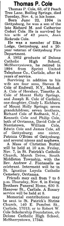 Catholic Church, Marsh Drive, South Middleton Township. He died Tuesday, Nov. 4, 1997 in his home. Born June 22, 1934 in Gettysburg, he was a son of the late Richard M. and Catherine Codori Cole. He was a member of St. Patrick Catholic Church, Carlisle. Retired in 1994 after 44 years of service with Sprint United Telephone Co. in Carlisle, he was a member of the Elks Lodge in Gettysburg and a 20-year veteran of Gettysburg Fire Department. Mr. Cole was a 1952 graduate of Delone Catholic High School in McSherrystown. Surviving are his wife of 42 years, Joan Rickrode Cole; four sons, Steven R. of Endwell, N.Y., Michael A. of Hershey, Timothy A. of Mt. Holly Springs and Joseph R. of Carlisle; a daughter, Cindy L. Eichhorn of Mt. Holly Springs; seven brothers, Richard of Redbank, N.J., Kenneth and Philip, both of Orrtanna, David of Norristown, and William, Edwin and James, all of Gettysburg; a sister, Patricia O'Brien of Gettysburg; seven grandchildren; and several nieces and nephews. He was preceded in death by a brother, Robert Cole. The Rev. Andrew J. Fontanella will officiate at Friday's mass. Burial will be in St. Ignatius Loyola Catholic Cemetery, Orrtanna. Friends may call from 7 to 8 P.M. today at Ewing Brothers Funeral Home, 630 S. Hanover St., Carlisle, where a rosary service will be held at 8 P.M. Memorial contributions can be made to St. Patrick Shrine Church, 140 E. Pomfret St., Carlisle 17013, or to Robert W. Cole Scholarship Foundation, Delone Catholic High School, McSherrystown 17344. |