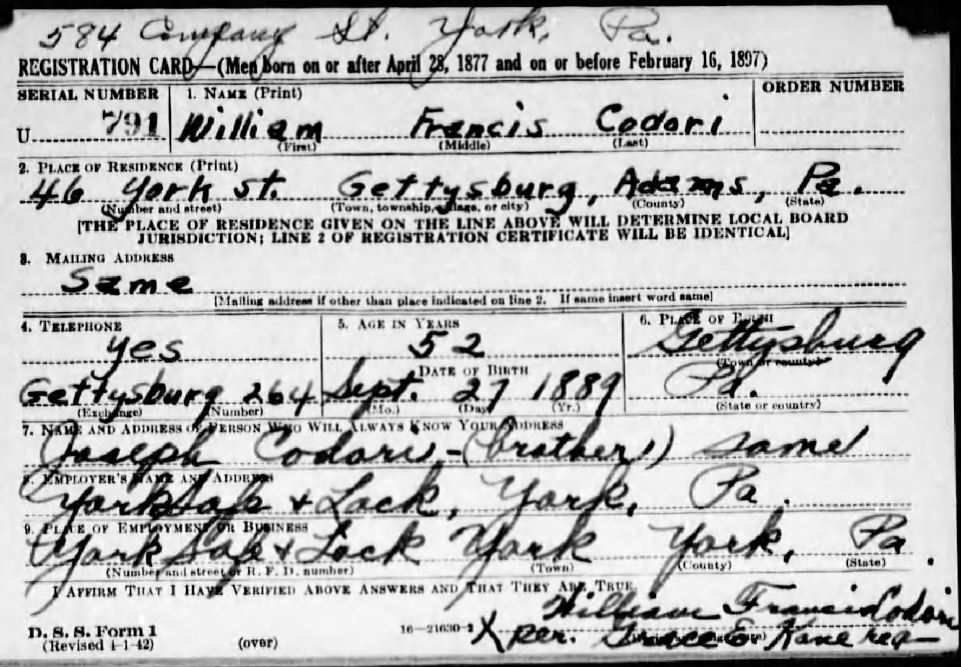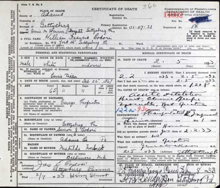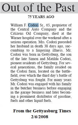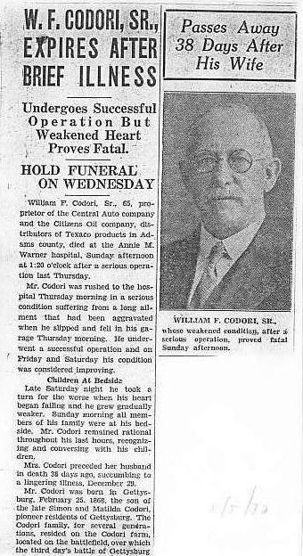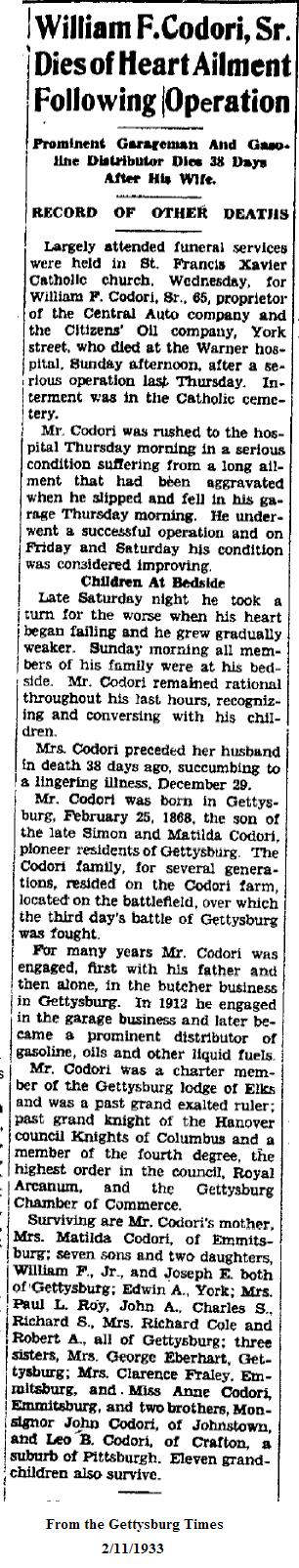 Part Two: He took a turn for the worse when his heart began failing and he grew gradually weaker. Sunday morning all member of his family were at his bedside. Mr. Codori remained rational throughout his last hours recognizing and conversing with his children. Mrs. Codori preceded her husband in death by 38 days ago succumbing to a lingering illness Dec. 20. Mr. Codori was born in Gettysburg, February 25 1868, the son of the late Simon and Mitilda Codori pioneer residents of Gettysburg. The Codori family, for several generations, ________ on the Codori farm, located on the battlefield, over which the third day’s battle of Gettysburg was fought. For many years Mr. Codori was engaged, first with his father and then alone in the butcher business in Gettysburg. In 1912 he engaged in the garage business and later became a prominent distributor of gasoline, oil and other liquid fuels. Funeral Wednesday The body will be removed from the Bender funeral home to the family home, 44 York Street, Tuesday afternoon and may be viewed Tuesday evening. Mr. Codori was a charter member of the Gettysburg lodge of Elks and a past grand exalted ruler; past grand knight of the Hanover council Knights of Columbus and a member of the fourth degree, the highest order in the council, Royal _______ and the Gettysburg Chamber of Commerce. Funeral services Wednesday morning at 9 o’clock from St. Francis Xavier Catholic church, with a requiem high mass. Surviving are Mr. Codori’s mother, Mrs. Matilda Codori of Emmitsburg; seven sons and two daughters. William F. Jr., and Joseph E. both of Gettysburg; Edwin A. York; Mrs. Paul L. Roy, John A., Charles S., Richard S., Mrs. Richard Cole and Robert A., all of Gettysburg; three sisters, Mrs. George Eberhart, Gettysburg; Mrs. Clerence Fraley, Emmitsburg; and Miss Anne Codori, Emmitsburg, and two brothers, Monsignor John Codori of Johnstown and Leo B Codori of Crafton a suburb of Pittsburgh. Eleven Grandchildren ________________ |