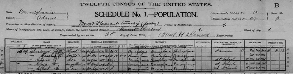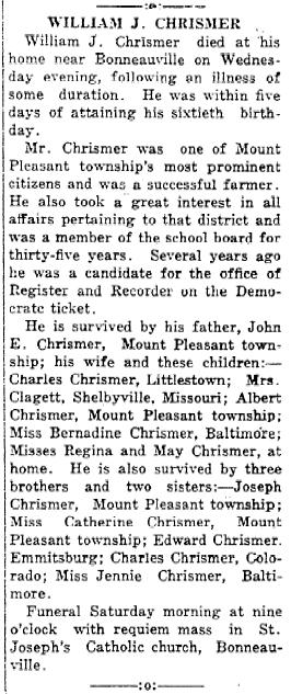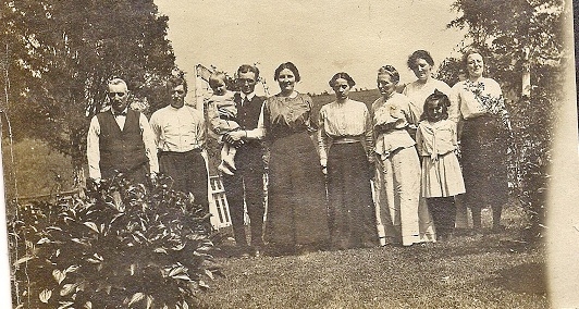 William J. Chrismer family L to R: William J. Chrismer (son of John E & Susanne (Codori), Albert, Little Richard Chrismer (Charles' son), Charles W. Chrismer, Bernadine, Mary (McSherry), Rosalia (Smith), Adelaide, Regina, & Mary Chrismer. These are all six of William & Rosalia's children. |