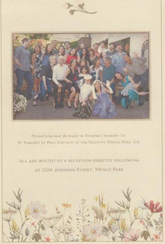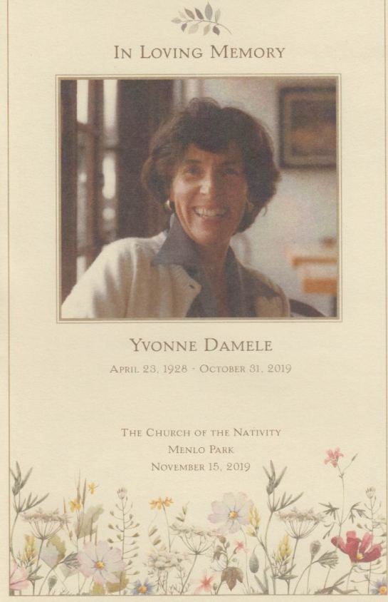 Damele April 23, 1928 - October 31, 2019 Yvonne Damele passed away peacefully from ovarian cancer on October 31, 2019 at her home in Menlo Park. Yvonne was preceded in death by her husband Joseph John Damele and her parents Fredrick and Alma Steinmetz. She is survived by her brother Charles Steinmetz, sister Mary Morris (Cal), children Mark Damele, Michele McMillan (Gordon), Catherine Damele (Chris Steckel), Christine Lies (James) and John Damele, nine grandchildren and seven great grandchildren. Yvonne was born on April 23, 1928 in Pittsburgh, Pennsylvania the middle of three children. She graduated from Marymount University in Los Angeles and worked for TWA as a flight attendant. She met Joseph Damele in San Francisco at a fraternity mixer for UCSF dental students. They moved to the San Francisco Peninsula where they raised their five children. Yvonne worked at Sunset Magazine for decades in the test and entertainment kitchens and later as an educational tour guide for school children. She thrived there because she enjoyed cooking, decorating and entertaining. Yvonne learned how to swim later in life and swimming with her friends at Burgess Pool in Menlo Park brought her so much joy. She was very involved at Nativity Church and the St Vincent de Paul organization. Yvonne truly loved life to the fullest through travel, entertaining and her friendships. Family was at the forefront of Yvonne's life and she was dedicated to her children and grandchildren. Her greatest joy was from family celebrations and get togethers. Yvonne had an uncanny ability to make people feel included and uniquely special. To her last days she defied aging. She was so much younger than her years. Her amazing strength, dignity and love will be sorely missed, as will she, by her family and all who knew her. In lieu of flowers donations would be gratefully accepted to St Vincent de Paul. The funeral for Yvonne Damele will be held on November 15, 2019 at Nativity Church in Menlo Park at 11:00 o'clock. |