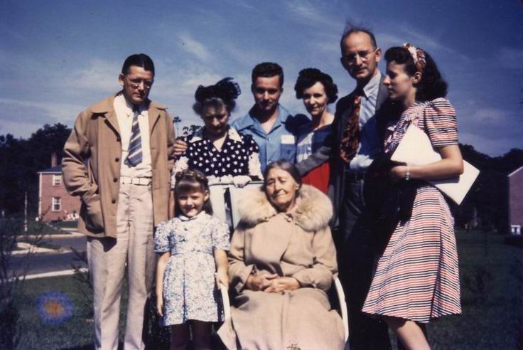 Center: Catherine Staub with a young Joan Munday. Standing L to R: Jim Munday, Anna Steinmetz Callahan, Thomas Callahan, Alma Steinmetz, Fred Steinmetz and Yvonne Steinmetz. Taken 1945 Colonial Village Baltimore, Maryland. |